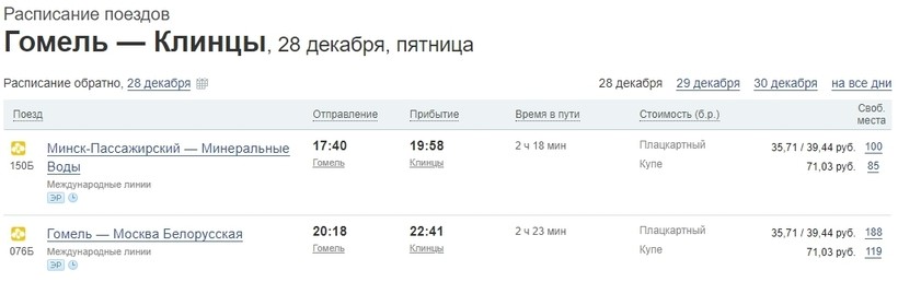 Ниже приведена информация о том, сколько часов вам потребуется, чтобы добраться от Гомеля до Клинцов, а также приведена примерная стоимость проезда (средняя цена билета) на том или ином виде транспорта.