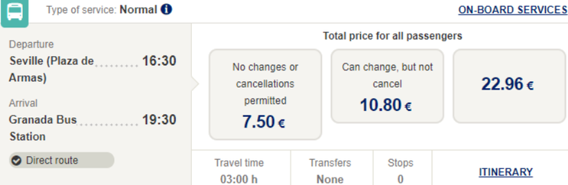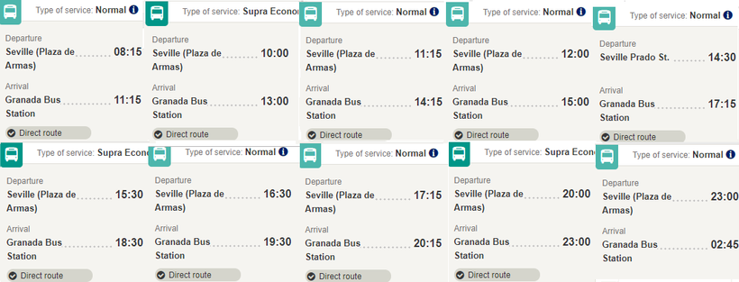 А еще обратите внимание, что все автобусы, кроме выезжающего в 23:00, следуют в Гранаду из Севильи без остановок и заезда в другие города, что позволяет им максимально быстро преодолеть маршрут.