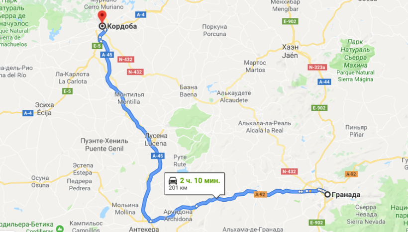 Кордова находится в 200 км от Гранады, и проехать такое расстояние на машине по испанским дорогам можно за 2 часа.