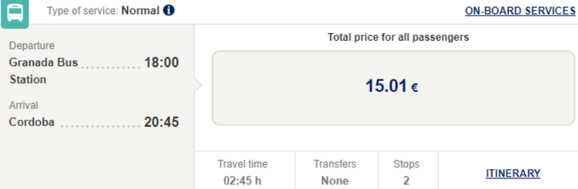 Поездка из Гранады в Кордову на двух поездах будет стоить от 23 евро (1700 руб.), а вот вариант с автобусом и поездом мне удалось найти по цене в 15 евро (1100 руб.), что и определило мой выбор транспорта по маршруту. :)