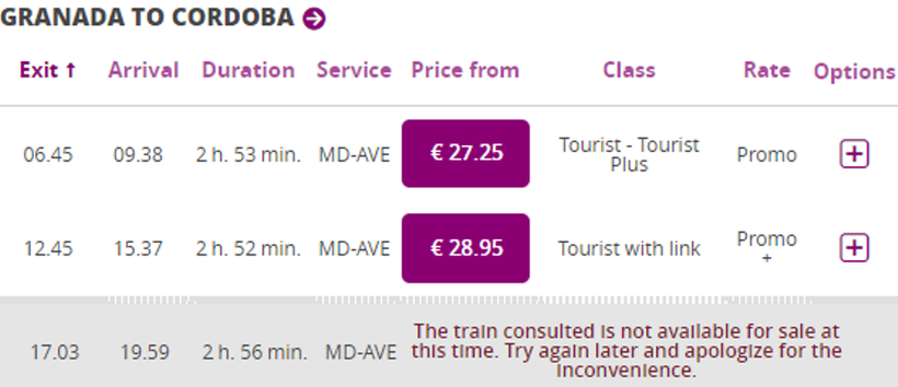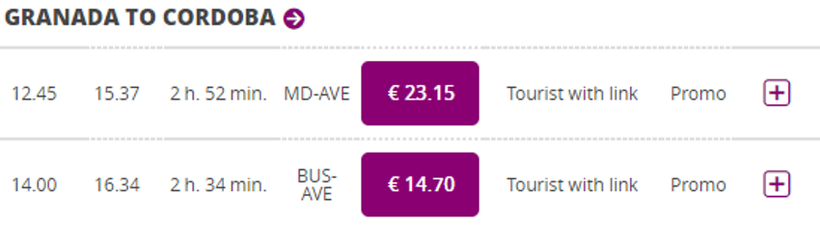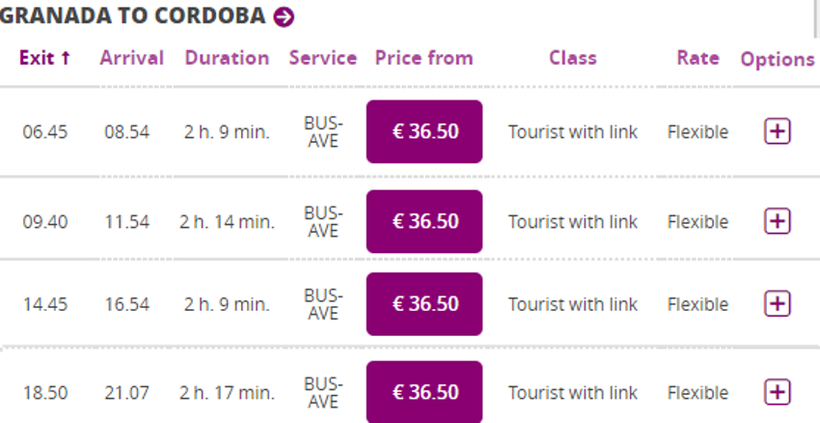 Кроме поездки из Гранады в Кордову на двух поездах, Renfe также предлагает так называемый вариант путешествия BUS-AVE. Заключается он в том, что из Гранады вас доставят до ж/д станции Антекеры Santa Ana на автобусе, а дальше поездка в Кордову продолжается на высокоскоростном поезде AVE. И таким образом время в пути составит всего 2 часа.