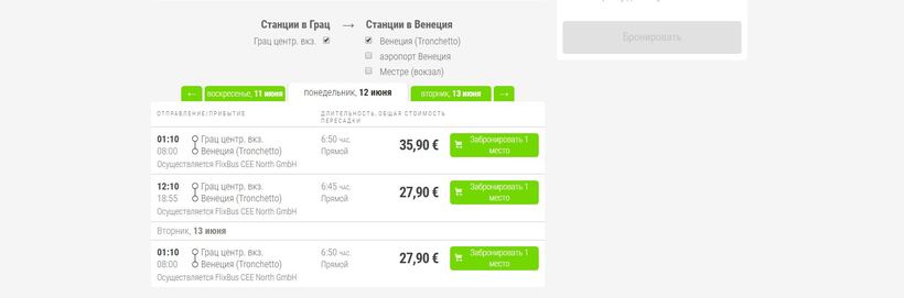 Отправляются автобусы от автовокзала, расположенного по соседству с главным железнодорожным вокзалом Граца. Дабы никто не заблудился, даю наводку:Отсюда есть целых 2 рейса в день непосредственно в Венецию. Важно: есть рейсы не до Венеции, а до аэропорта Венеции (он расположен довольно далеко от города), а также до Местре (это маленький городок является как бы пригородом Венеции, от него еще предстоит доехать в Венецию). Нас интересуют только рейсы до Тронкетто, то бишь вот сюда: Вот расписание всех 2 рейсов: