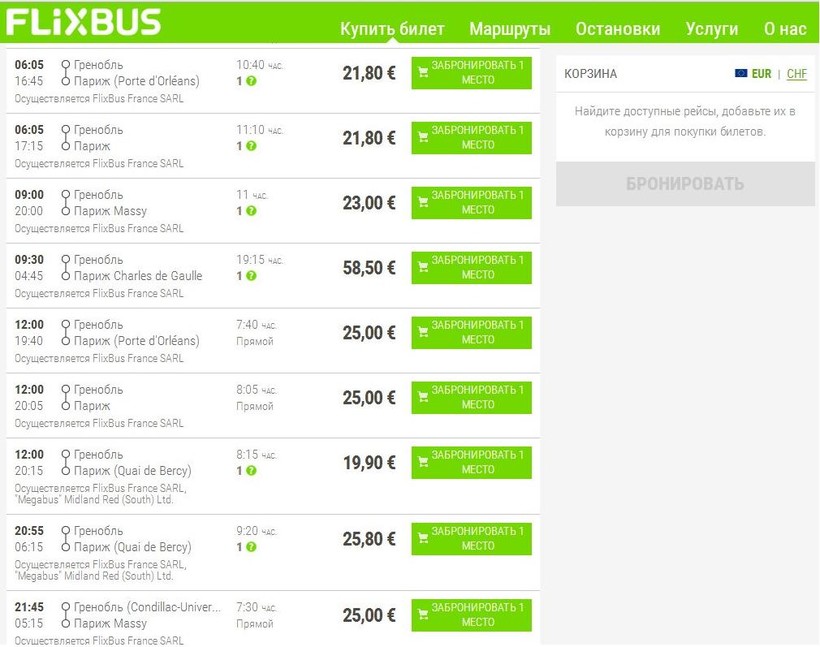Компания Flixbus совершает 5-7 рейсов, начиная с 06:05 и заканчивая 22:20. По некоторым дням движение автобусов начинается в 07:45, а заканчивается в 23:59. Лучше всего смотреть актуальное расписание на сайте. Некоторые рейсы прямые, некоторые – с пересадками. Все автобусы отправляются от остановки на Place de la Gare (это возле ЖД вокзала в Гренобле). Прибывают они на несколько автостанций в Париже: Porte d'Orléans, Massy, Quai de Bercy и в аэропорт Charles de Gaulle. Поездка на прямом автобусе займет от 7 ч до 9 ч 15 мин, с пересадкой – от 8 ч 15 мин до 19 ч 15 мин.