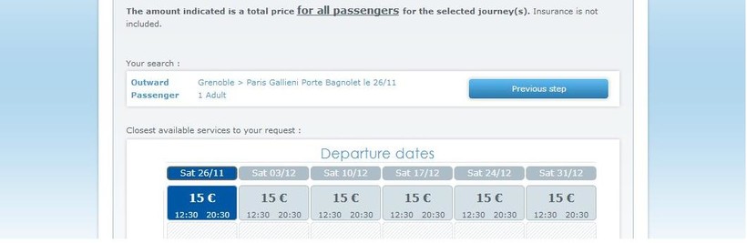 Автобусы Eurolines ездят между Греноблем и Парижем (Gallieni Porte Bagnolet) только по субботам в 12:30. В пути они проводят 8 ч.