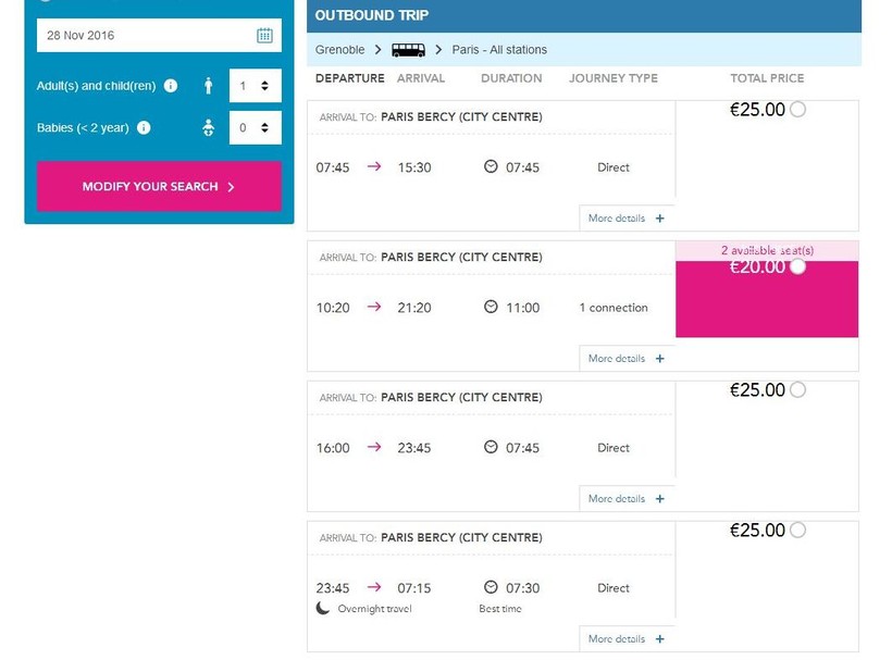 Ouibus также совершает поездки от Гренобля до автостанции Paris Bercy в центре города. Ежедневно есть три прямых рейса: в 07:45, 16:00 и в 23:45. Время в пути – 7,5 часов.