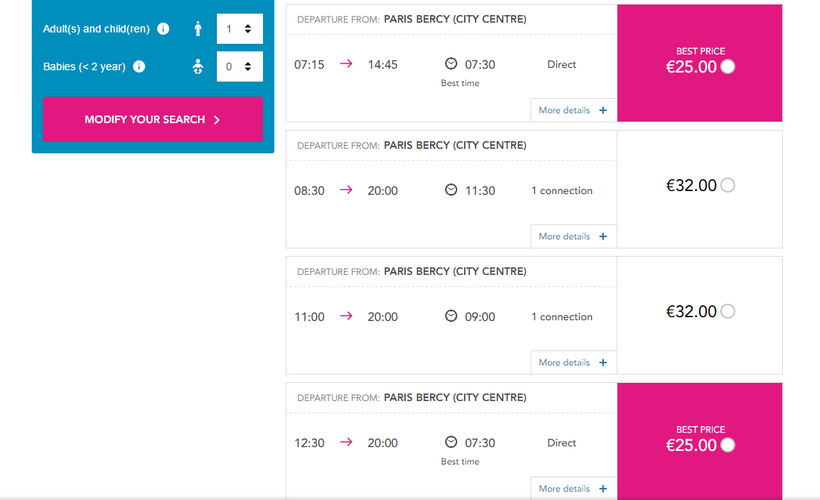 - Рейсы Ouibus начинают свое движение с Quai de Bercy в 07.15, 08.30, 11.00, 12.30, 19.55, 21.30, 23.00.