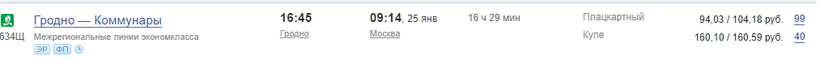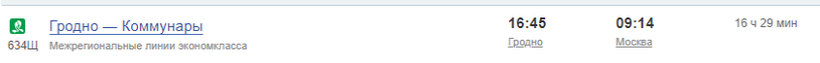 Поездка на поезде для меня стала лучшим вариантом путешествия по маршруту по комфорту, ведь ежедневно из Гродно отправляется несколько прицепных вагонов в поезде «Гродно — Коммунары» до Москвы. Отправляется он в 16:45 и преодолевает свой путь всего за 16,5 часов.