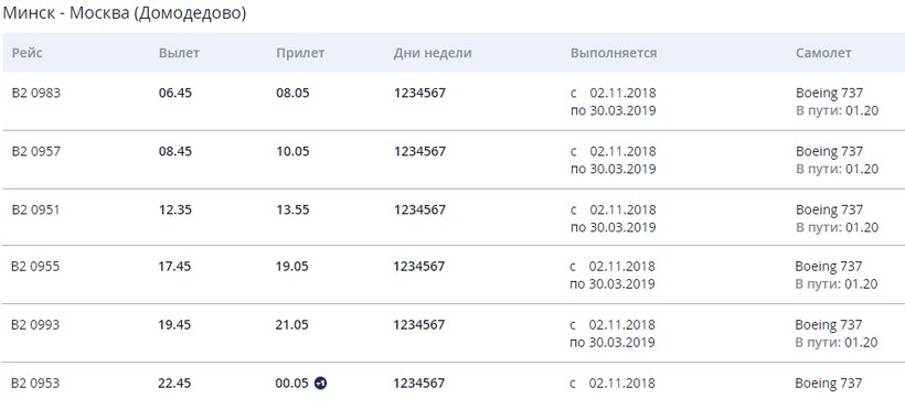 - компании «Белавиа» в «Домодедово» в 06:45, 08:25, 12:35, 17:45, 19:45 и 22:45;