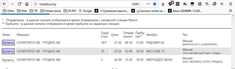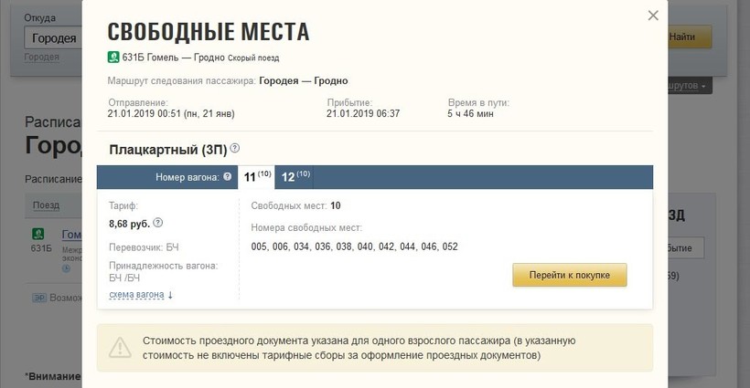 Здесь начинается самое интересное — цена может быть как 16 белорусских рублей (500 российских рублей), так и 22 белорусских рубля (670 российских рублей). Это зависит от места покупки. Билет можно купить неполный (то есть от Несвижа), а можно за полную стоимость (от Солигорска). И билет Несвиж — Гродно не продается онлайн, только Солигорск — Гродно. Странно, что билеты обратного направления (Гродно — Несвиж) прекрасно продаются онлайн за 16 белорусских рублей.