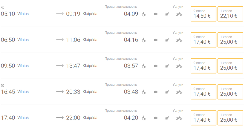 Билет на поезд из Вильнюса до Клайпеды обойдется от 17,4 евро или 1100 руб.