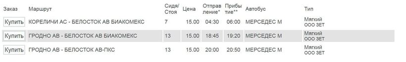 Можно доехать до польского Белостока, а там уже пересесть на автобус до Парижа. С автовокзала Гродно до Белостока ходит 3 автобуса в день, вот скриншот их расписания: