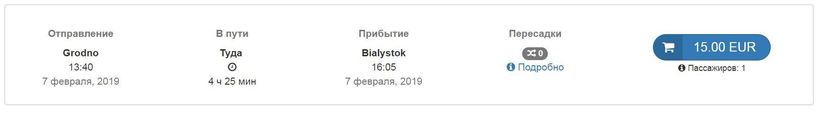 Цена билета на рейс от Гродно до Белостока на рейс белорусских перевозчиков составляет 15 белорусских рублей (примерно 6 евро).