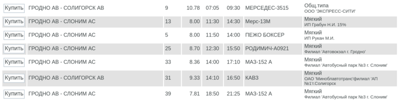 Автобусных рейсов по этому маршруту ходит более чем достаточно. Вот скриншот с официального сайта автобусной системы Беларуси - ticketbus.by: