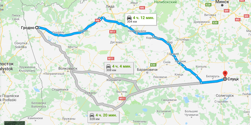 Гродно и Слуцк разделяют 304 км, которые на автомобиле можно преодолеть за 4-4,5 часа.