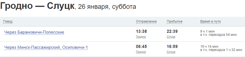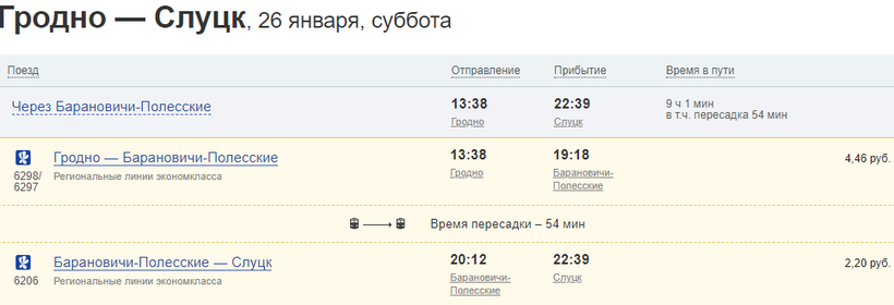 - выезд из Гродно в 13:38 на поезде «Гродно-Барановичи», прибытие в Барановичи в 19:18;