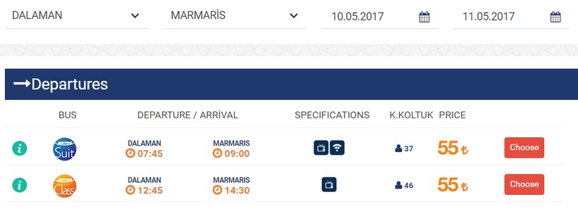 Единственный общественный транспорт, курсирующий из Даламана в Мармарис, - это автобусы. Данный маршрут обслуживает несколько перевозчиков: