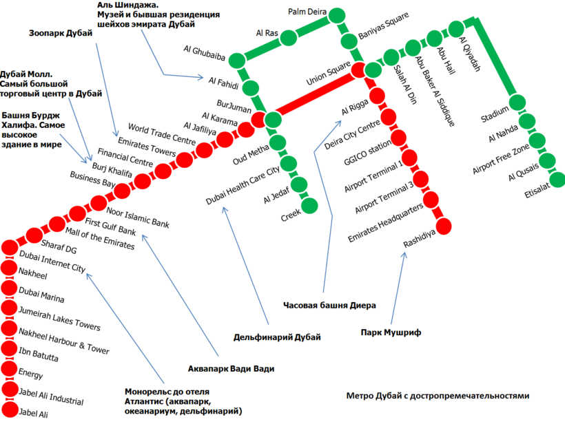 Станции метро расположены в 1 и 3 терминалах Дубайского международного аэропорта. На метро можно доехать до всех основных достопримечательностей города, а также посмотреть сам город, потому что метро наземное. :)