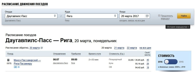Стоимость билетов начинается от 33,96 белорусских рублей в плацкартном вагоне и заканчивается 95 белорусскими рублями в СВ. В российских рублях разброс цен составит 1040-2950 рублей. В европейской валюте 16,8-48 евро.