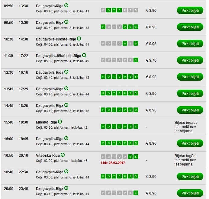 Билеты доступны к покупке на сайте БЖД. Доступна как покупка билетов на сайте, так и электронная регистрация на рейс. При желании всегда можно купить билеты и в кассе железнодорожного вокзала в Даугавпилсе (улица Stacijas).