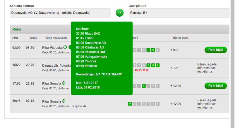 Для того, чтобы узнать расписание по конкретным станциям (в том числе Даугавпилса и Полоцка), надо навести мышкой на зеленый восклицательный знак, что находится рядом с направлением, и вот мы получаем полностью все расписание движения транспорта по часам, плюс видно и дни курсирования.