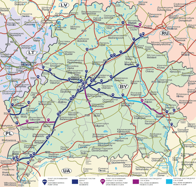 А вот в Белоруссии водители машин с иностранной регистрацией платят за пройденное расстояние. Но там есть много и бесплатных региональных дорог. В данном случае платить за проезд не придется)). Вот вам на всякий случай карта платных автомагистралей Белоруссии.