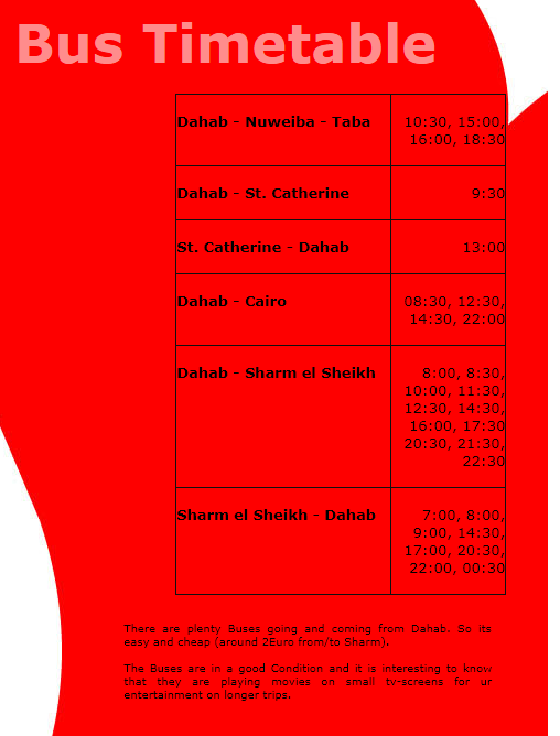 В течение дня из Дахаба через Нувейбу в Табу курсирует четыре автобуса.