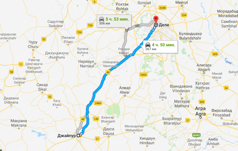 Джайпур и Дели разделяют 267 км, но из-за плотного индийского трафика маршрут можно проехать в среднем за 5 часов.