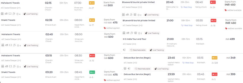 Автобусы из Дели в Ришикеш курсируют ежедневно в 02:15, 02:35, 02:45, 03:15, 03:20, а в вечернее время с 20:45 до 24:00 примерно с интервалом в 15 мин.