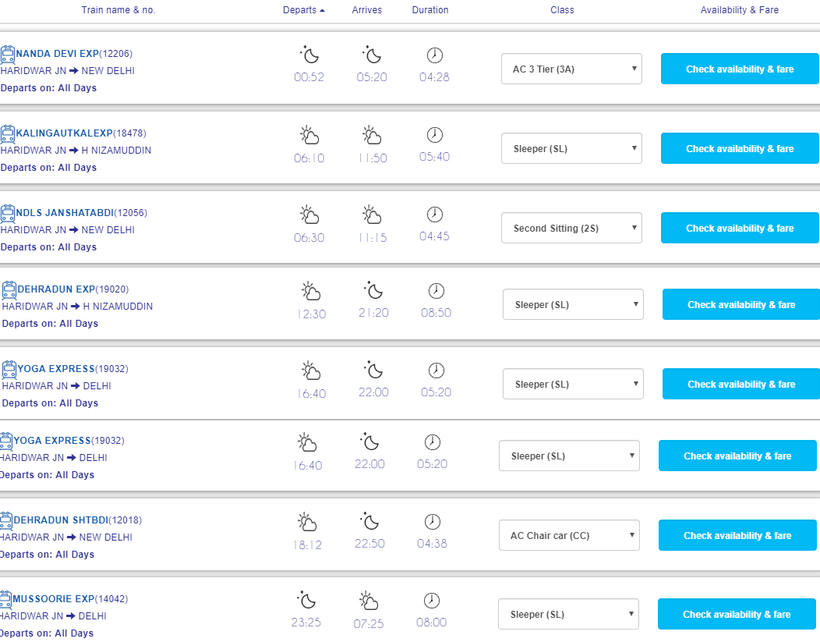 Самый дешевый билет из Хардвара в Дели в вагоне класса Second Sitting стоит 140 рупий (130 рублей), а поездка в вагоне CC-класса обойдется от 840 рупий (780 рублей).