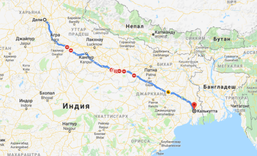 Дели — Калькутта — маршрут на карте