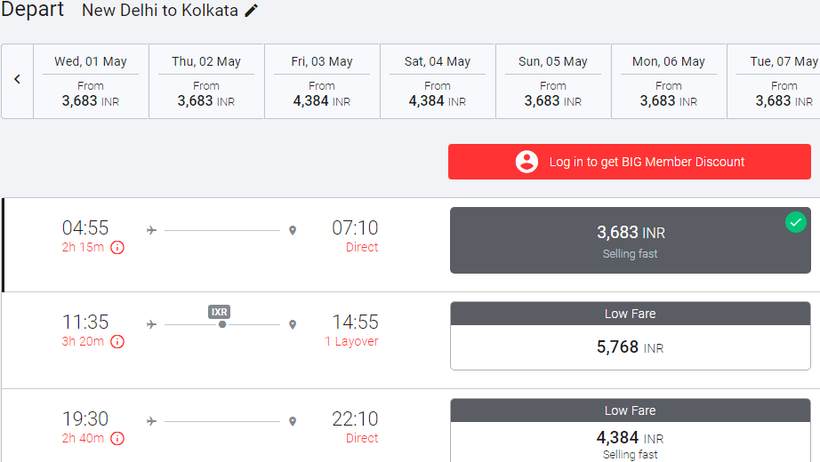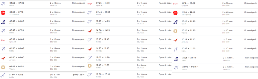 Самолеты из аэропорта Дели в аэропорт Калькутты вылетают ежедневно с 04:50 до 22:00, интервал между рейсами примерно 25 минут (есть небольшой перерыв с 09:45 до 13:50). Продолжительность полета в среднем 2 часа 15 минут.