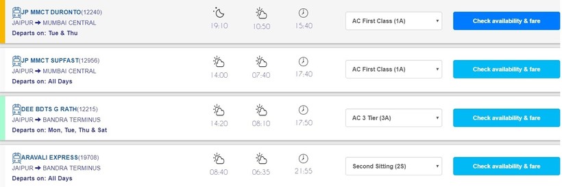 Ежедневно отсюда в Мумбаи курсирует только 2 поезда. Первый отправляется в 08:40 и идет почти сутки. Второй уходит в 2 часа дня. Если поедете на нем, то в дороге придется провести 17 часов 40 минут. Также есть один поезд, который отправляется только по вторникам и четвергам. Он уходит из Джайпура в 19:40. Дорога в Мумбаи займет почти 16 часов. Еще один поезд ходит по понедельникам, вторникам, четвергам и субботам. Отправляется он в 14:20. На месте будете почти через 18 часов.