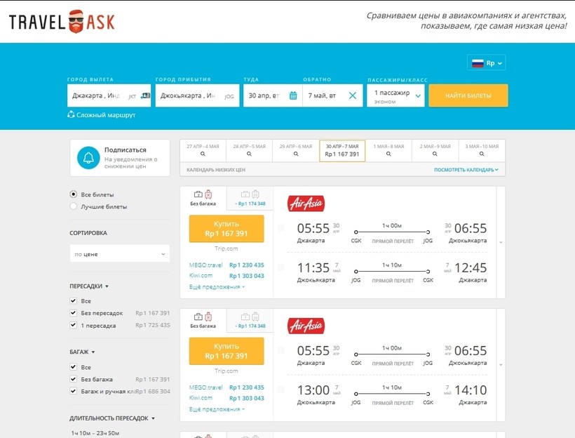 На сайте компании-перевозчика цена билета из Джакарты в Джокьякарту — 150 000 IDR (9,50 €)