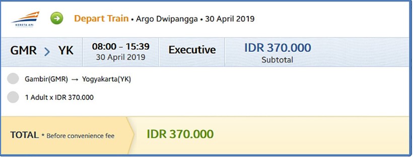 Билет на поезд класса экзекутив стоит 370 000 IDR (23 €).
