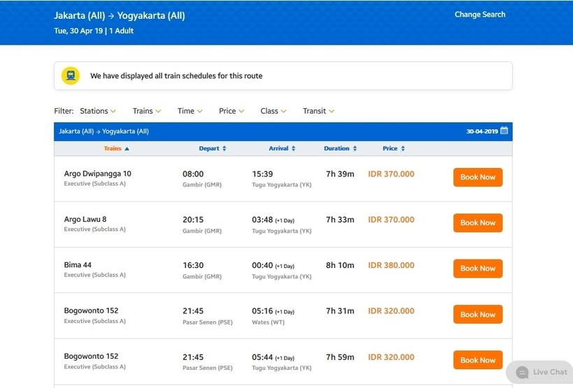 В Индонезии железнодорожными перевозками занимается компания PT Kereta Api Indonesia. На ее сайте можно узнать расписание и цену билета, но нельзя купить билет, ведь для этого нужна местная кредитная карта.