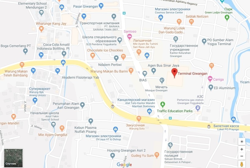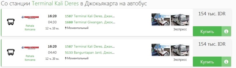 Отправляется автобус в 16:20, а приходит в 4:40 на автовокзал Giwangan в Джокьякарте.