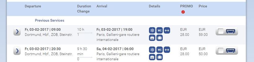 Отправляются автобусы в Дортмунде вот отсюда: А прибывают в Париже на разные остановки, в зависимости от конкретного рейса.