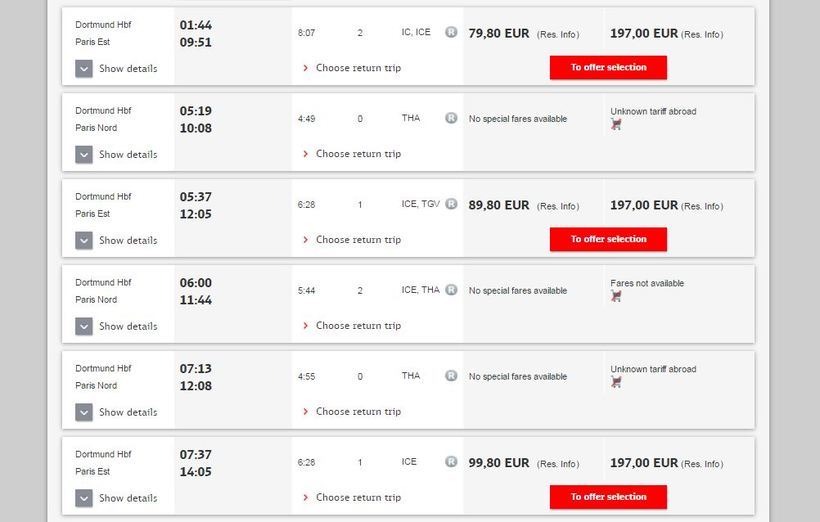 Сразу скажу, поездов по данному направлению ходит очень много. Типов полно: и немецкие типы поездов, описанные вот в этой статье, а также поезда Thalys. Какими воспользоваться – личное дело каждого, но можно столкнуться с некоторой проблемой. Выбирая билеты на сайте немецкой железной дороги, было предложено купить билеты на поезд с пересадками. На прямые поезда купить билет онлайн было невозможно, креплю пруф-скриншот: