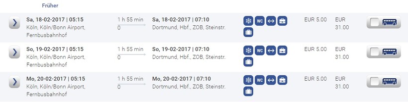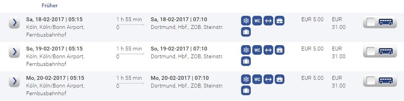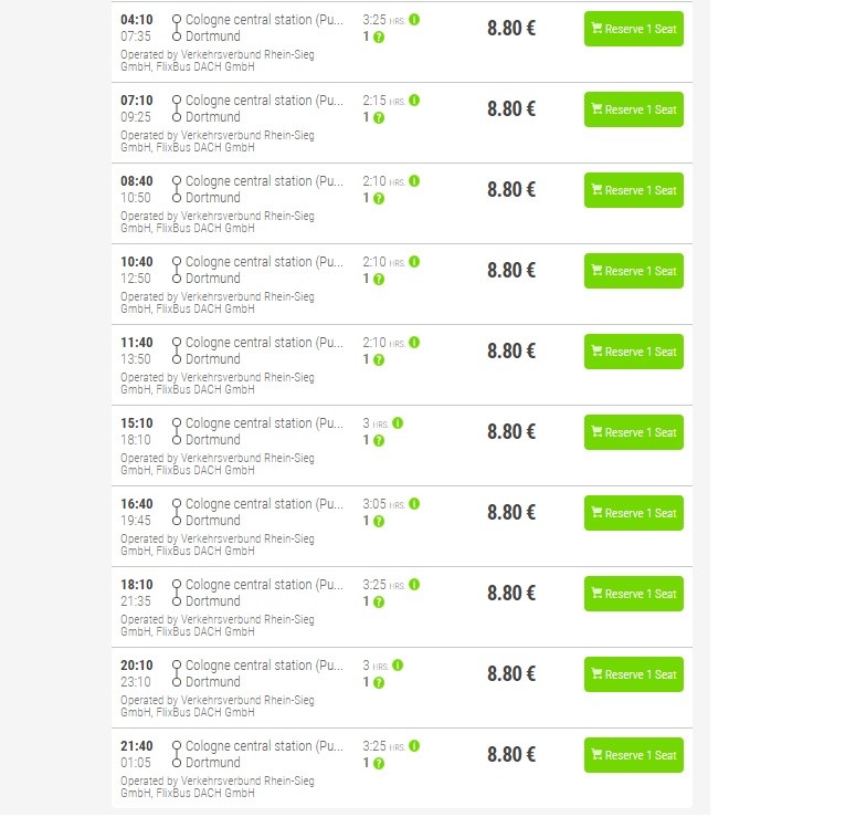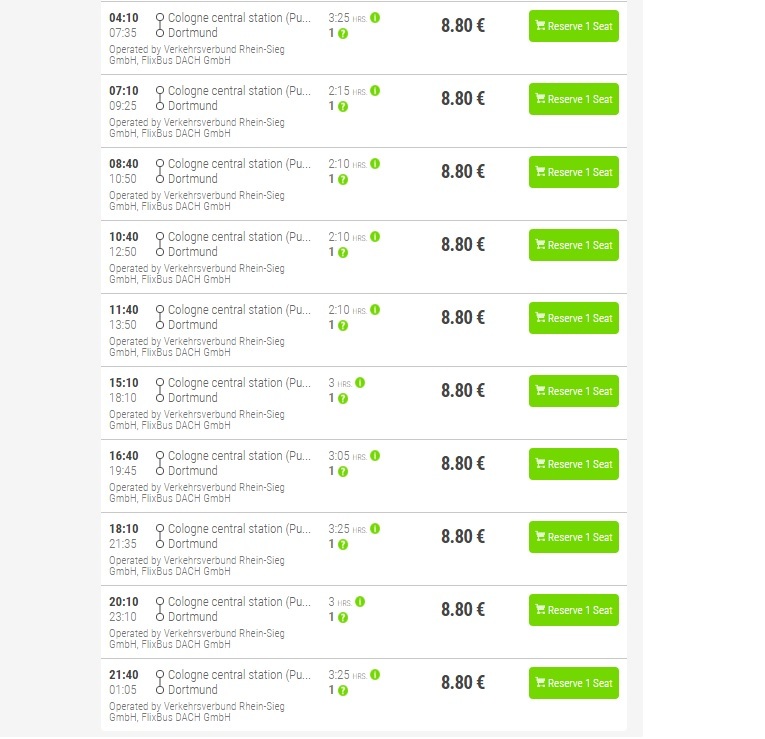 Есть еще прямые рейсы в Дортмунд из пригорода Кельна, из Леверкузена (остановка Cologne Nord, Leverkusen), из Рефрата (остановка Cologne East, Refrath). Как раз с пересадкой в Леверкузене можно доехать из Кельна на автобусах Flixbus.