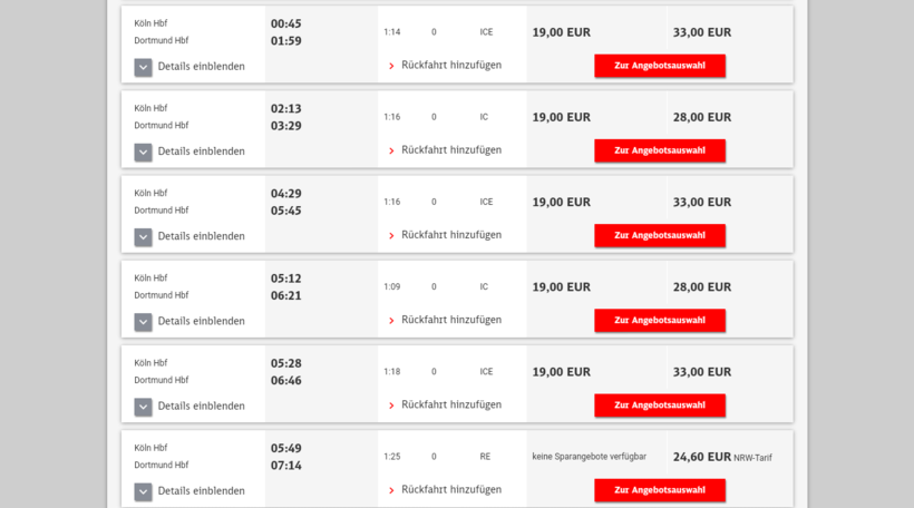 Для просмотра расписании выберете из Cologne (Public Transport via Leverkusen) в Dortmund.