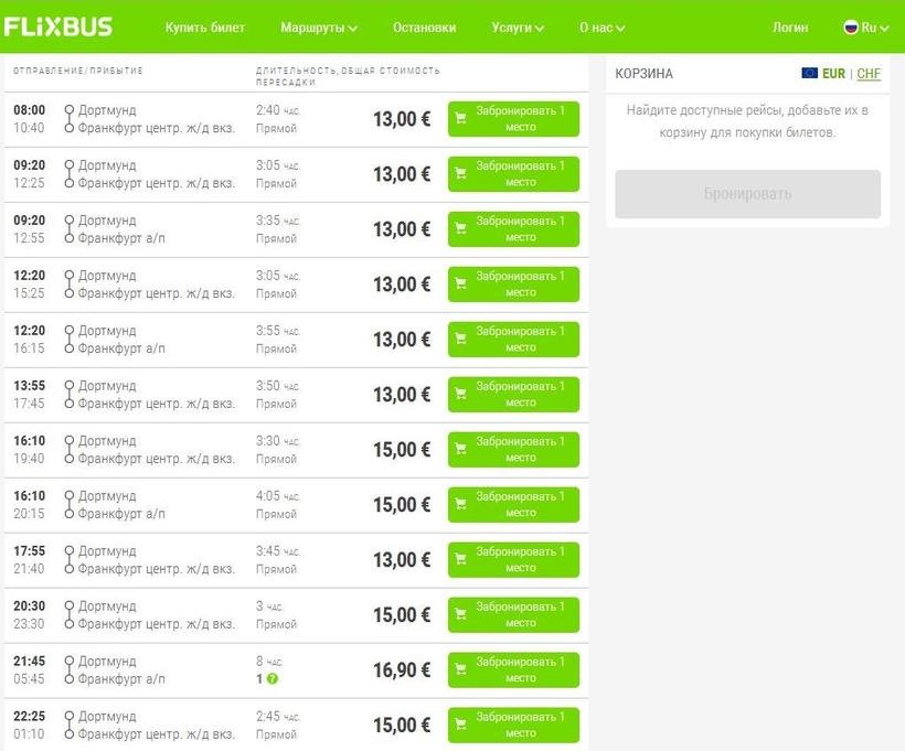 Flixbus совершает ежедневно множество рейсов, но расписание каждый день разное. Начинается движение автобусов по некоторым дням в 03:00, а по некоторым – в 08:00. Ездят они до позднего вечера, ежедневно есть от 8 до 12 прямых рейсов – выбор большой. Отправляются автобусы от Центрального автовокзала (на Steinstrasse 54), рядом с ЖД вокзалом. Некоторые рейсы позволяют выйти во Франкфурте как возле Главного ЖД вокзала на Stuttgarter Straße, так и в аэропорту возле Терминала №2. Но большинство в аэропорт не заезжает, смотрите внимательно расписание. Flixbus едет быстрее, чем Евролайнс, а может от маршрута зависит, но они довозят пассажиров до Франкфурта за 2 ч 40 мин-4 ч. На сайте этого перевозчика написано, что во всех автобусах есть кондиционер, туалет, розетки и бесплатный беспроводной интернет. По факту бывает и по-другому, может чего-то не оказаться.