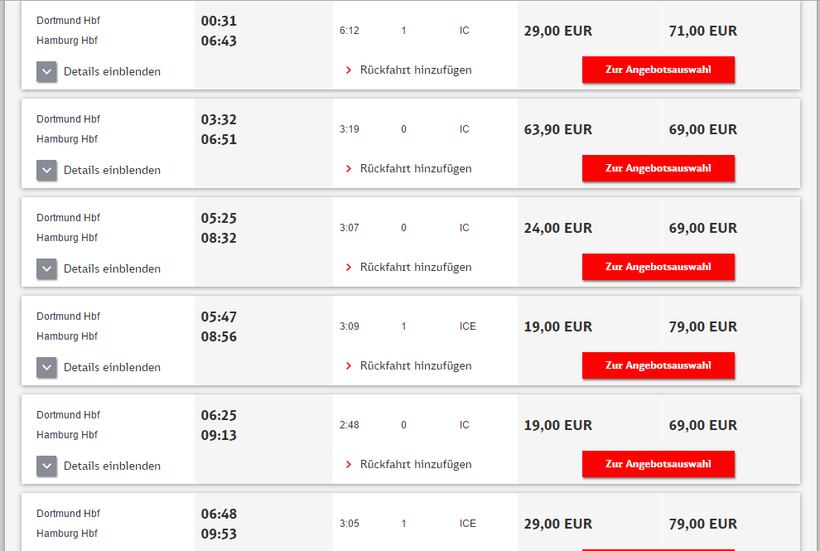 Кроме автобуса есть только один способ добраться из Дортмунда в Гамбург общественным транспортом без пересадок – это поездка на поезде. Здесь всё просто. С центрального ЖД вокзала Дортмунда в Гамбург ходят скоростные поезда ICE (InterCityExpress) и IC (Intercity), дорога занимает всего около трёх часов. Я бы сам поехал именно поездом, если бы не был таким скупердяем и не трясся над каждым потраченным евро. Разобраться в системе железнодорожного транспорта Германии сперва достаточно сложно, но купить билеты на вокзале вам всегда может помочь кто-нибудь из сотрудников, а разобраться в типах поездов и видах билетов поможет вот этот рассказ.