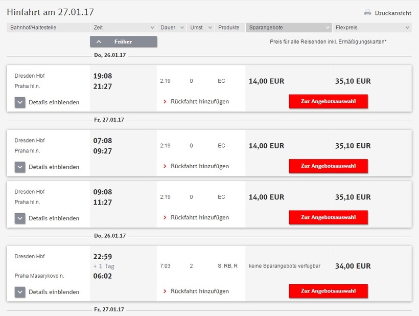 Вот теперь пора вспомнить сайт чешской железной дороги. Если на немецком сайте билет во второй класс стоит 14 евро, но на чешском - 10 евро. Вот так можно сэкономить на поездке.