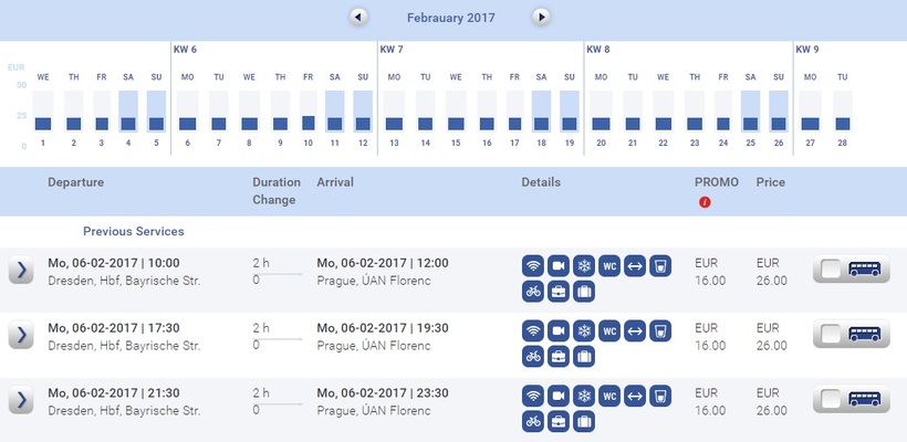 Сперва расскажу об автобусах Eurolines, как и в случае с поездами, расписание можно смотреть на немецком и чешском сайтах. Автобусы ездят 3 раза в день, а поездка занимает 2 часа. Автобусы этой компании комфортные, мне приходилось на них ездить и раньше, ничем не уступают поездам. Для поиска введите от станции «Dresden» до станции «Prague», различное написание чешской столицы часто сбивает меня с толку) Прибывают автобусы на автостанцию ÚAN Florenc (Křižíkova, 279/8), она находится возле станции метро и недалеко от железнодорожных вокзалов.