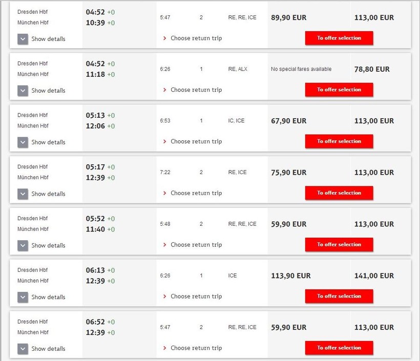 Ниже приведена информация о том, сколько часов вам потребуется, чтобы добраться от Дрездена до Мюнхена, а также приведена примерная стоимость проезда (средняя цена билета) на том или ином виде транспорта.