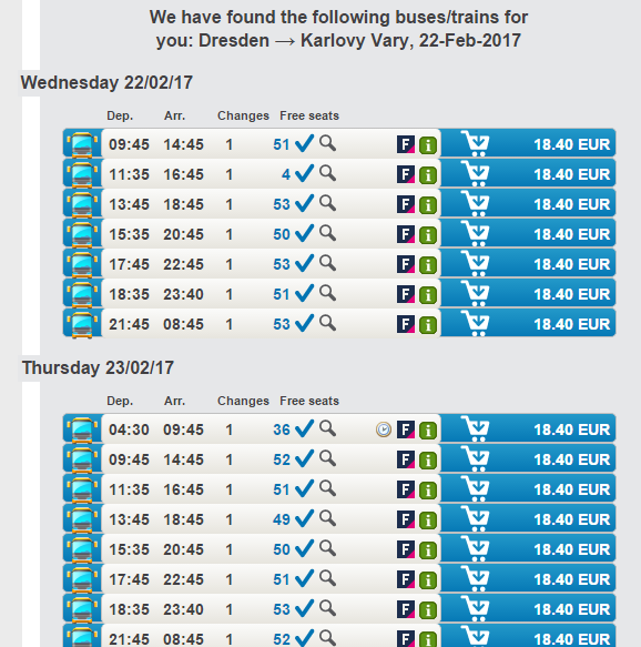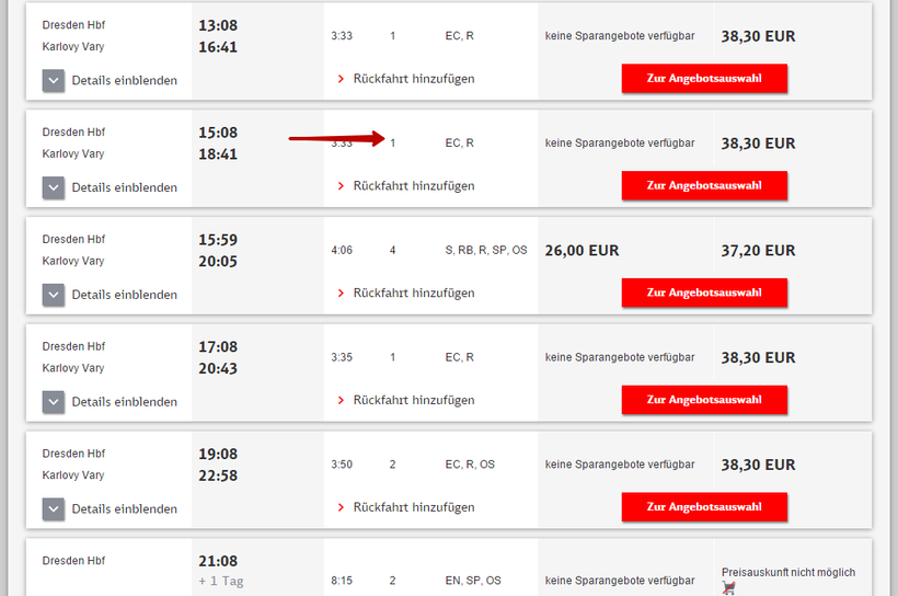 Вот так выглядит официальный сайт немецких железных дорог с расписание поездов из Дрездена в Карловы Вары. Обратите внимание на количество пересадок.