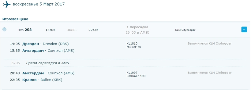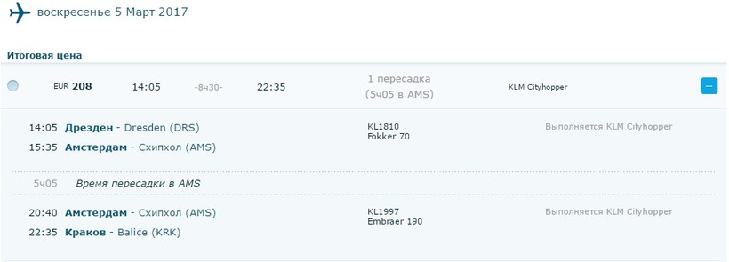 Расстояние между Дрезденом и Краковом более 500 км, поэтому рассмотреть авиаперелет вполне разумно. Я обратилась к авиапоисковикам, воспользоваться можно любым, например, этим. К сожалению, перелетов лоукостерами, которые часто радуют ценой и прямыми перелетами не обнаружила. Как, собственно, и прямых рейсов. С одной пересадкой перелет из Дрездена в Краков возможен только голландской компанией KLM, через Амстердам. Такие рейсы компания делает ежедневно, кроме субботы, общее время в дороге - восемь с половиной часов. Пересадка в Амстердаме - пять часов, это неплохо - можно сгонять и глянуть одним глазком на столицу Нидерландов. Выбрать нужный вам рейс вы можете на сайте авиакомпании.