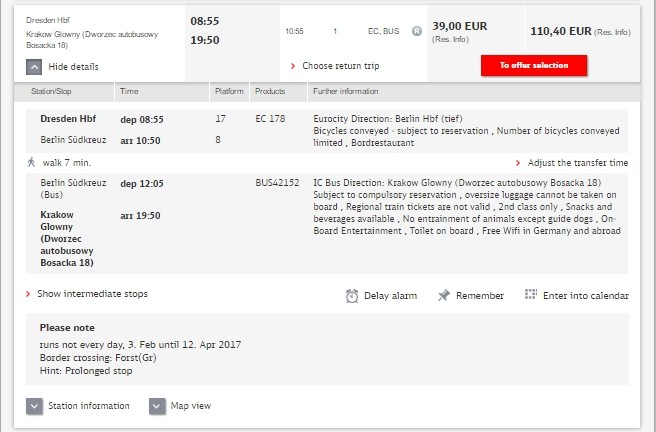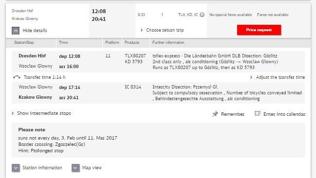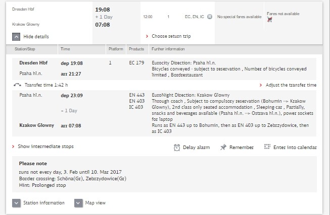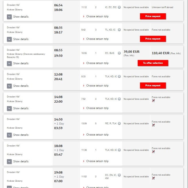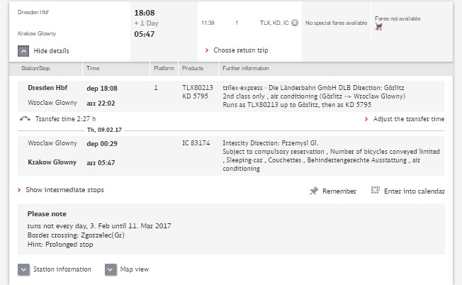 Прямых поездов из Дрездена в Краков нет, вариантов добраться с пересадками - множество. Поиск оптимальных путей я начала с сайта Deutche Bahn, который является неплохим планировщиком. Подробно о железных дорогах Германии вы можете прочитать здесь. Сайт выдал мне приблизительно такую картинку