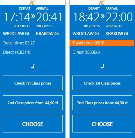 Из Вроцлава в Краков ходят польские поезда Intercity, комфортабельные и относительно недорогие. Расписание можно посмотреть на сайте польских железных дорог. Время в пути на вечернем поезде составит три с половиной часа, на ночном - 5 ч. 18 мин. В поезде есть спальные вагоны, поэтому ночной переезд не будет утомительным.