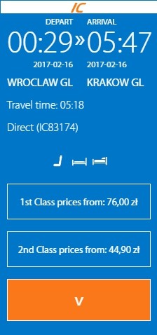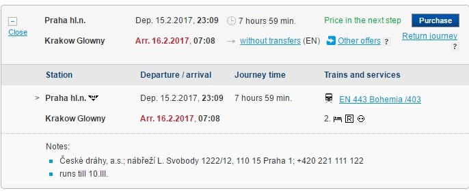 Поездку на поезде из Праги в Краков планируем на сайте чешских железных дорог. Нам подходит поезд, отправляющийся с центрального железнодорожного вокзала Праги в 23:09. Время в пути - 8 часов, в ситуации с ночными поездами длительный переезд предпочтительнее, так как можно комфортно выспаться. Конечно, если ехать в спальном вагоне. Чешский поезд предоставляет такую возможность.